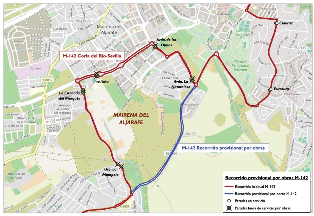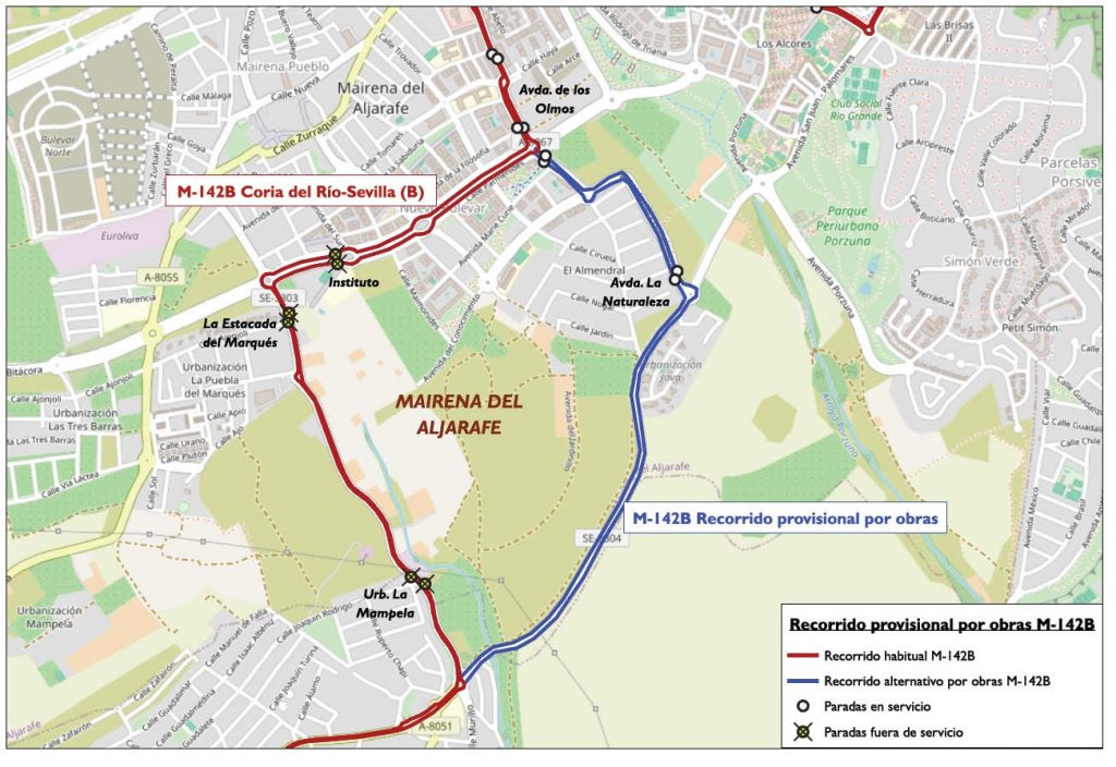 Línea M-142 Sevilla: dejará de realizar las paradas de Avda. de la Naturaleza, Avda. de los Olmos, Instituto Hipatia, Urb. Estacada del Marqués y Urb. La Mampela, todas en ambos sentidos de la marcha.