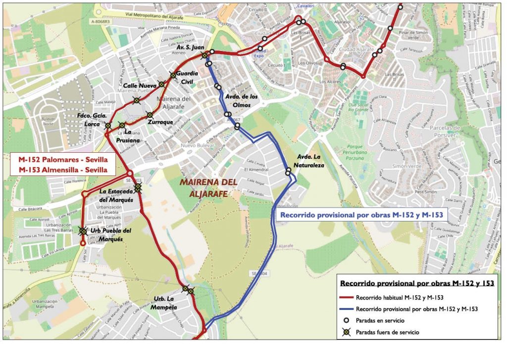Líneas M-152 y M-153 destino Sevilla: dejarán de realizar las paradas de Urb. La Mampela, Urb. Estacada del Marqués, Urb. Puebla del Marqués, La Prusiana, calle Zurraque, Avda. de San Juan (2 paradas). Paradas alternativas: Avda. de Almensilla (CaixaBank) en Palomares del Río y en Mairena del Aljarafe, Avda. de la Naturaleza, Avda. de los Olmos (M-142), Avda. de los Olmos (esq. Avda. Filosofía), Avda. de los Olmos frente nº 40 y Avda. de los Olmos (bomberos).